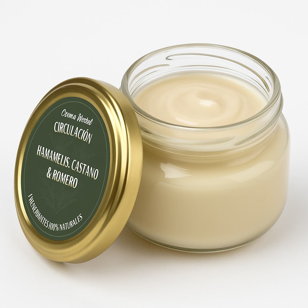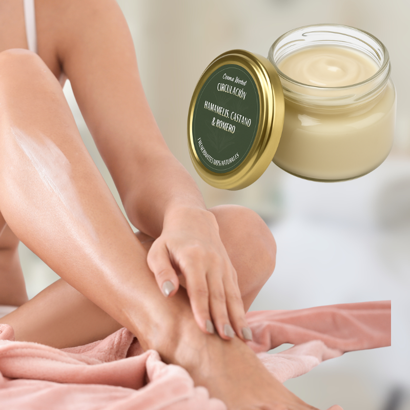 La Crema Circulación está formulada con extractos naturales de Hamamelis, Castaño de Indias y Romero, conocidos por sus propiedades antiinflamatorias y activadoras del flujo sanguíneo.